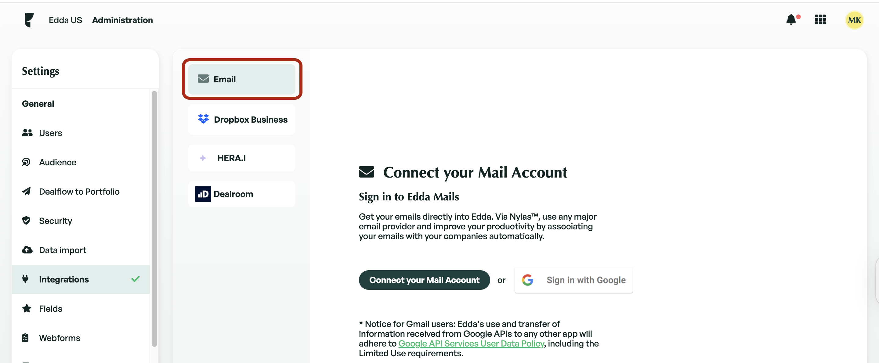 Edda Mails - Edda mails provide the ability to connect your email account with Edda to automatically import relevant emails to their corresponding company.