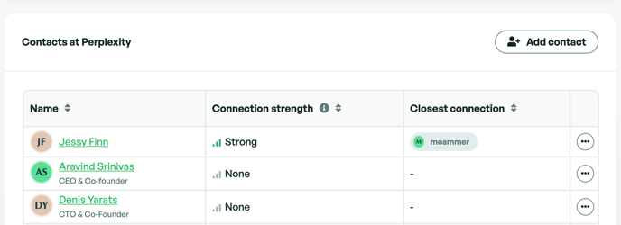 The contact section of the company profile displays the contact and only the closest user from your team. However, if a contact has interacted with several team members, you can view the connection strength for all users by navigating to the contact's profile and selecting the Connections section.