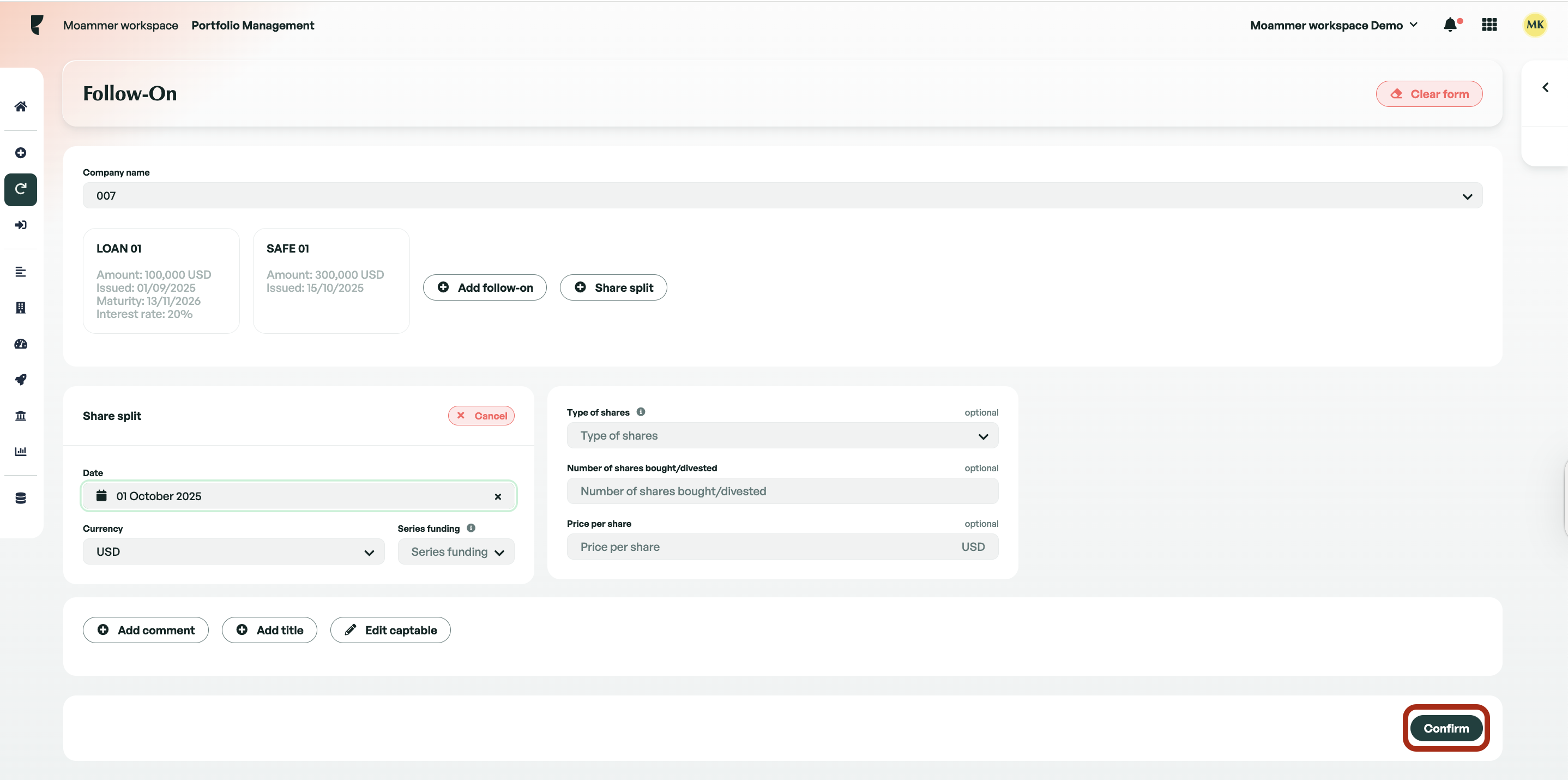 Adding a share split helps you record changes in share distribution. This is typically done to adjust the company’s share price (for example, in a 2-for-1 or reverse split), or to reflect ownership adjustments following changes in valuation or a recapitalization, or to align share distribution before a new funding round, among other cases.