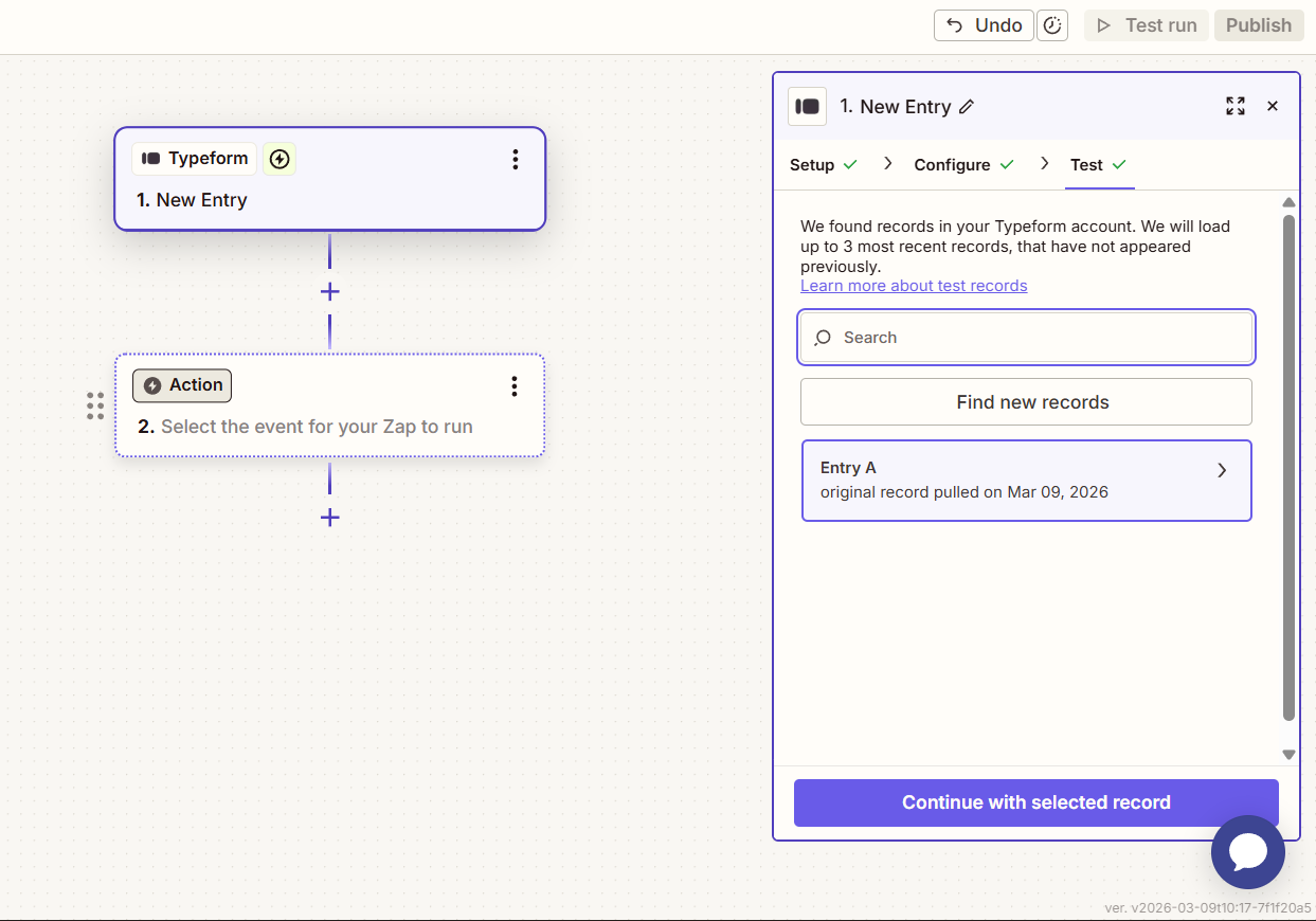 5. Please make sure to test your trigger, and once the test passes you can move on to configure the Action by clicking 'Continue with selected record'.