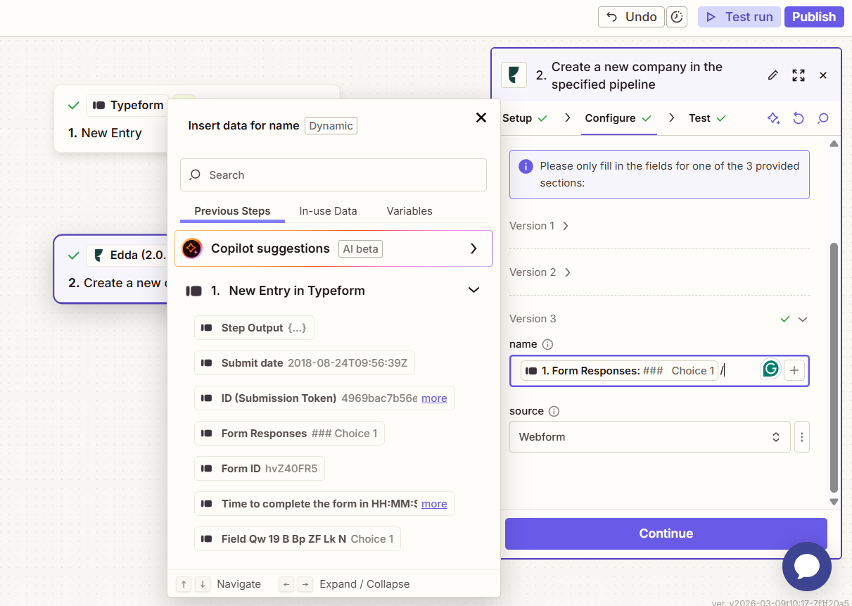 3. In 'Configure', please add your workspace and pipeline, and then scroll a bit down to the 'Version 3' dropdown menu. There, you'll want to map the field from the webform where the name of the company is with the name that Zapier will add to the newly created company for you.