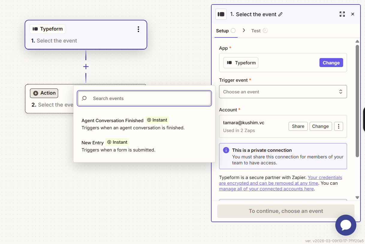 - Once you have the trigger selected, make sure to connect your Edda Workspace with Zapier via the ‘Account’ dropdown: